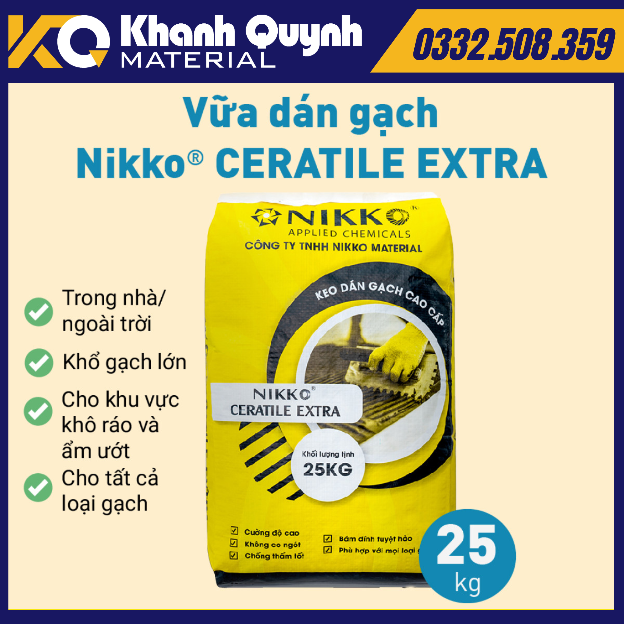 NIKKO CERATILE EXTRA là một loại vữa dán gạch trộn sẵn, được sản xuất từ xi măng đặc chủng, silicat chọn lọc, polymer và một số phụ gia tăng tính thi công và chống thấm. NIKKO CERATILE EXTRA thuộc nhóm C2 và đạt tiêu chuẩn Việt Nam TCVN 7899-2:2008 và ISO 13007-2:2005