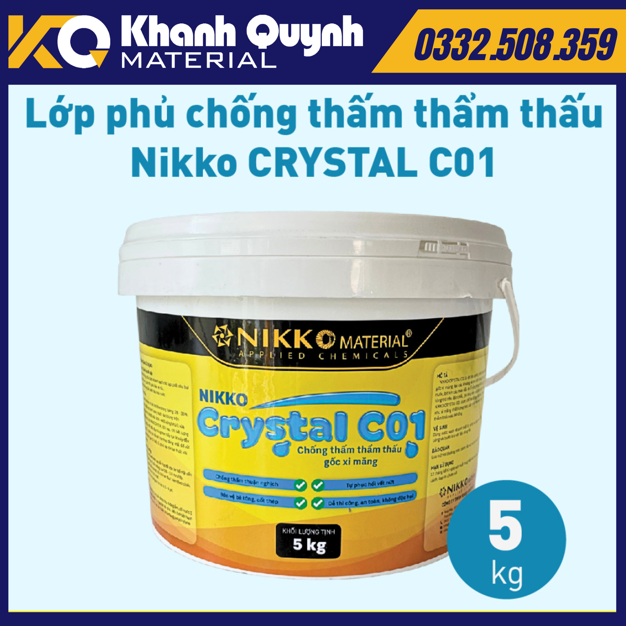 NIKKO CRYSTAL C01 là vật liệu chống thấm gốc xi măng được sản xuất bằng thiết bị và nguyên liệu nhập khẩu từ Mỹ. NIKKO CRYSTAL C01 có thành phần xi măng silicat, được tạo nên từ quá trình xử lý đặc biệt của một nhóm các hợp chất hoạt tính và vật liệu bột cát thạch anh.